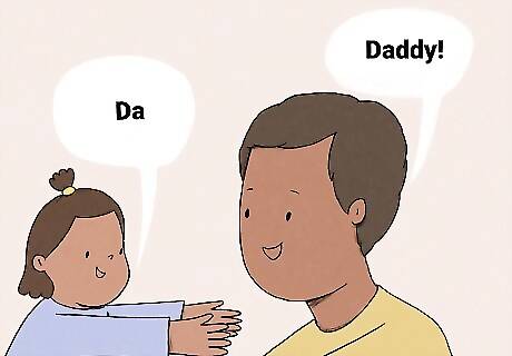 This is an easy way to build on what they know. If your baby is at the "ma," "da," and "ba" stage, repeat the sound back at them and then say the entire word a few times. For example, if your baby looks at you and says, "Ma!" you can point to yourself and say, "I'm mama! Mama. Can you say mama?" If your baby says, "Daddy!" you can add on to that by saying, "Daddy is right here. Daddy loves you so much."