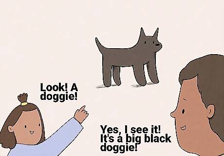This is a super easy way to introduce new phrases! When your child verbally identifies something, build on that language by attaching new verbs, adjectives, adverbs, and nouns. Say the updated phrases clearly so your child can hear and understand them. For example, if your child says “red truck,” you can respond with something like, “Yes, that’s a big red truck!” If your child says "my ball," you might respond with something like, "Let's get your soft blue ball." If your toddler says "Look! A doggie!" you could respond with, "Yes, I see it! It's a big black doggie!"
