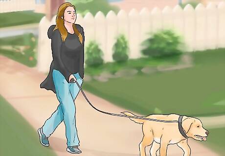 Make exercise a part of your daily routine. Your dog needs to burn off more calories than it is taking in. This will allow the dog to lose some of the weight it has put on. Exercise it every day, several times a day. When choosing what type of exercise to do with the dog, take into account your dog's physical fitness and its build. This exercise could be as simple as getting in the routine of walking it in the morning before you go to work and walking it again when you return from work. If your dog has a lot of stamina and the physical build for more exercise, consider taking it hiking or taking it along when you go for a run. This can also be something that you build up to together!