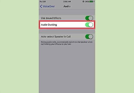 Slide the Audio Ducking button to the “on” position. It is located in the third group of menu options. This will keep the level of any music or audio unaffected while the VoiceOver feature is in use.