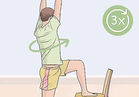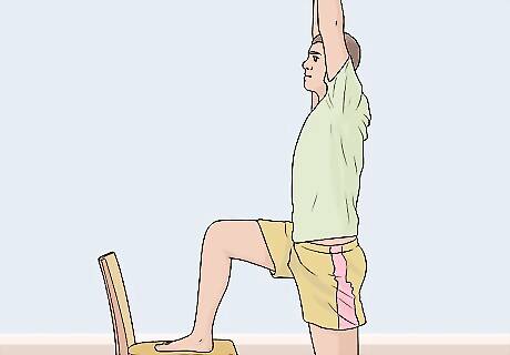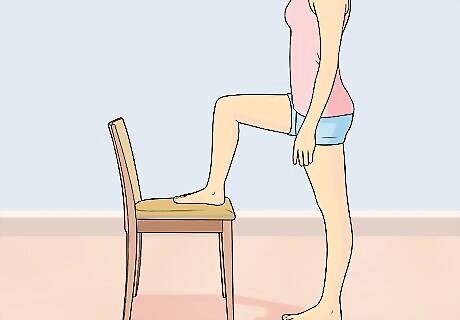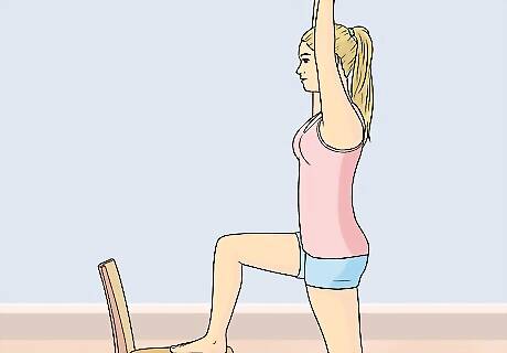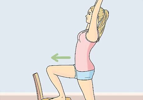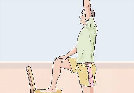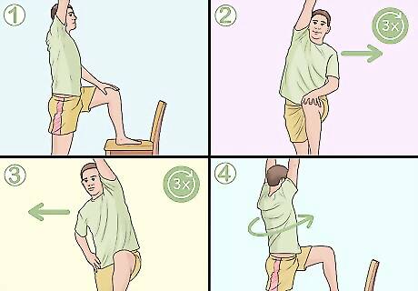 Switch legs and repeat the entire 3D stretch sequence. After you finish the last stretch in the 3D stretch sequence, take your right foot down from the chair and step up with your left foot instead. Then, go back to the first step again and repeat the entire sequence to do all of the same stretches on this side. If you were kneeling for the stretches, bring your right foot back and kneel on both knees. Then, move your left foot in front of you so you are kneeling on your right knee. Tip: If you are kneeling on a hard surface, make sure to reposition the towel or exercise mat under your knee before you begin the stretch.