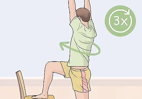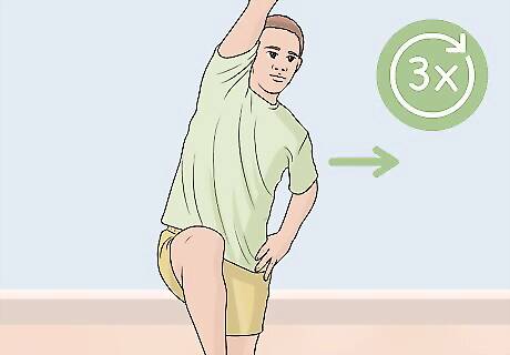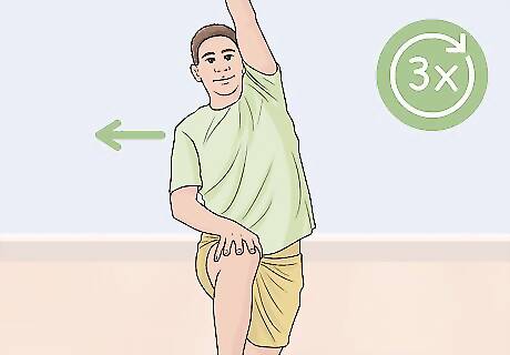 Repeat the move 3 times on the opposite side. After you stretch to the right, place your left hand on your left hip and raise your right arm over your head. Lean to the left as you bend your knee to stretch forward. This side will feel a little different than the first since you are using a different range of motion.