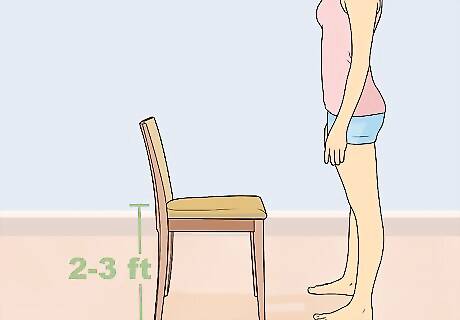 Stand in front of a sturdy chair with your feet shoulder-width apart. You can use a regular kitchen chair, or use an exercise bench. Just make sure that the item is sturdy and that the seat or bench is about 2 to 3 ft (0.61 to 0.91 m) off of the ground. This height will allow you to get into the right position while standing. You can also do this stretch while standing at the bottom of a staircase. You may also kneel for the stretch and this way you won’t need to use a chair at all. Tip: Some people find that kneeling for the 3D hip flexor stretch is uncomfortable because it hurts their knees. If you choose to kneel, do it on a soft surface, such as a carpeted floor, or place a towel or exercise mat under your knees before you begin.