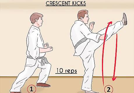 Work on crescent kicks. Start out in the bow position again. Bring your back leg forward, moving it a bit in front of your other leg as you bring it into the air. Now, your foot should go in an arch in front of your body. As you bring your leg in front of you back towards the other side, the knee should be facing your body and the sole of your foot should be pointing upwards. Bring it down the other side and back behind your body. Try ten reps, and then move to the other leg.