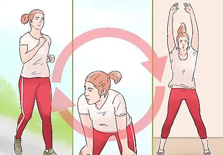 Keep moving. If you need a break between your warm-up exercises, that's fine. However, you should still keep moving. When you're taking a break, you need to jog in place to keep the momentum going. Once you've recovered a bit, try another warm-up exercise. Make sure you're rotating through exercises. That is, you can do jumping jacks once, then go back to them after doing a couple of other exercises.