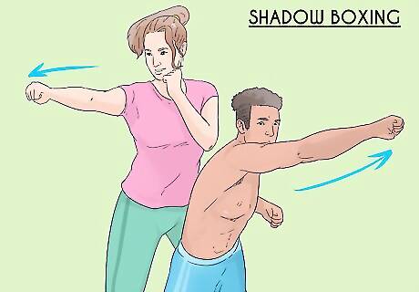 Punch the air. Since you'll use punch-like movements in your workout, do some punches while warming up. Start by punching with one arm only, ten times in a row. After you've completed that move, switch to the other arm. Start with your left foot a bit forward. Spring forward a bit on both feet, then punch forward with your left arm. It's similar to a boxing move. For an extra challenge, hold onto some hand weights while you practice your punches.