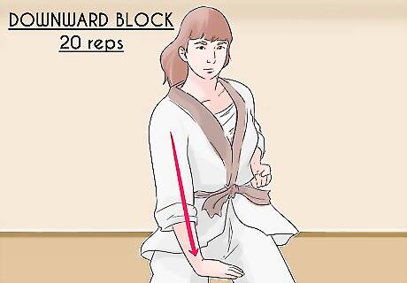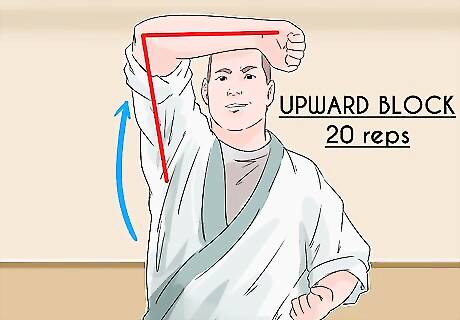 Do an upward block. Make a fist out of your hand. Your arm should be bent. Bring that arm out in front of you with your forearm facing out. Your arm should be about waist level and parallel to the ground. Now, raise the arm up, bringing it in front of your face and then up above your head. Your arm should now be just above your forehead with the forearm still out. Bring your arm back to the start. Alternate arms for 20 reps. Start out slow, and work up to a faster pace over time. You can add more blocks as you get stronger.