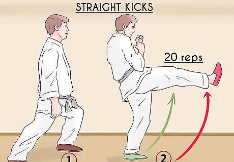 Perform straight kicks. Start in bow stance by having one leg in front and one in back. You'll be kicking with the one in back. Place your hands on your hips in preparation for the move. Rock forward on to your front leg a bit to begin the move. As you move your weight to your front leg, your back leg should begin to lift off the ground. Keep it straight. Use the muscles in that leg to kick it forward, while pushing up with the other leg, keeping that knee slightly bent, not locked. Kick as high as you can and still keep your balance. Use your muscles to pull the leg back down to the starting position. Try 20 kicks on one side, aiming for waist-high, then move to the other leg and repeat.