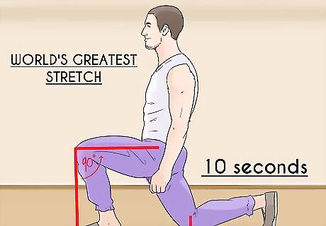 Try the "world greatest stretch." This yoga stretch works to stretch out your whole body, which is essential when doing a kung fu workout. Start with a forward lunge. Step far forward with one foot. As you do, lower yourself towards the ground. The front knee should reach a 90-degree angle and the back knee should almost touch the ground. Hold this move for about 10 seconds. Using the arm that's on the same side as your forward leg, bend it at the elbow and lean as far forward as you can on the inside of your leg. You can try to the touch the ground with the elbow. If you can't touch the ground, just get as far as you can. Your other hand should be flat on the ground to help you stay upright. Hold for about 10 seconds. Next, place your hands on both sides of your foot. You may need to support yourself on your fingers. Straighten your front leg up, moving the back leg as needed, and lift up your front foot's toes. Hold for 10 seconds. Move to put the other leg forward, and repeat.