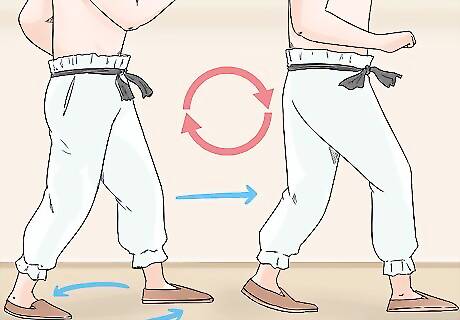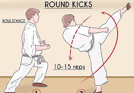 Do round kicks. Begin in a defensive bow stance, with one leg in front of the other. You can bring your arms up in front of you like you're getting ready to punch. Make fists and have your underarms facing your body with your elbows bent. Shift your weight to your front leg, lifting the back leg off the ground. Instead of going straight forward, lift it to the outside and bring it forward. As you bring it forward, move it from outside to inside. Basically, you are lifting it and swiveling your foot so it comes up with the toe pointing to the other side of your body as the foot moves in front of you. Your knee should be bent until your leg gets in front of you, then you should kick out. Your foot on the ground will turn, and your body will lean slightly way from the kick. Do ten to fifteen reps and move to the other side.