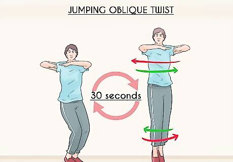 Do a series of jumping oblique twists. This movement warms and stretches your whole body. Start with your feet together. Your arms should be in front of your chest, with your elbows out and palms towards the ground. Start by jumping in the air and twisting your feet and knees to the right, then jumping again and twisting to the left in quick succession. Your chest should stay forward. Keep going back and forth quickly. Try 30 seconds of this move at a time.