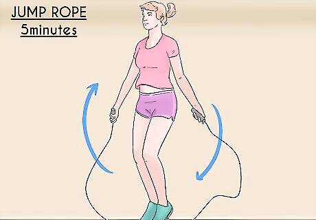 Jump rope. Jumping rope is another good warm-up that may take you back to your grade-school days. Get a sturdy jump rope, and try jumping continuously for a set period. It gets your heart pumping and warms up muscles throughout your body. Do what you can at first, and work up to jumping for 5 minutes.