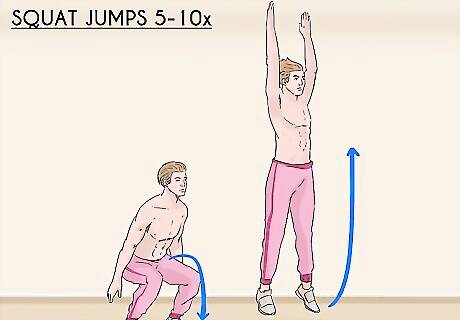 Add squat jumps. Begin with a squat, where you act like you're sitting in a chair but there's no chair behind you. You'll need your feet shoulder-width apart. Slowly lower yourself down like you're sitting. You should reach a point where your knees are at a 90-degree angle. Now, simultaneously raise your arms above your head as you jump into the air from the squat position. Land in a standing position, and do it all again. Try starting with 5 reps and moving up to 10 gradually.