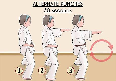 Alternate punches. Start in a high horse stance, meaning don't go as deep as you did in the downward blocks. You arms should be bent at the elbow and by your side, with the underarms facing upwards and fists clenched. Start by punching one arm forward. As you punch forward, rotate the wrist so your inner arm is facing down by the time your arm is extended. As you come back, rotate it back upwards. Punch straight out from the center of your body, rotating your torso back and forth to punch. Move back and forth between arms for about 30 seconds. To make it a bit more difficult, get lower in the horse stance.