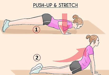 Try push-ups with extra stretches. Begin in a push-up position. Lay face down on the ground with your toes holding your lower end up (you can also use your knees instead). Place your palms on the ground (or knuckles, which is harder). Lower yourself to the ground, then bring yourself back up, keeping your body straight throughout. Try ten reps, then stop. Using one arm to balance you in the center, stretch the other arm out straight up from your shoulder. Hold for ten seconds. Next, jump your legs out, and turn your body towards the arm you have out, including turning your feet. Stretch that arm up into the air. Your face should be looking upward. Hold for ten seconds. Repeat the whole movement on the other side. Do another five pushups.
