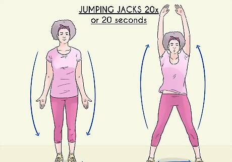 Do some jumping jacks. One effective warm-up is the standard jumping jacks that you did in elementary school. Stand with your arms at your side and your legs together. Simultaneously jump your legs out to shoulder-width apart as you bring your arms straight out from your shoulders and then straight up above your head. Do a set amount, such as 20 jumping jacks or 20 seconds of jumping jacks. Work up to more as you can.