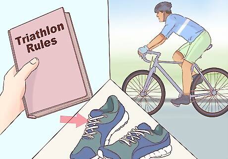 Focus on your transitions. Races can be won or lost in the transition zone. Planning a smooth and efficient transition and practicing transitions regularly before your event can make all the difference in where you place in the race. Set up a specific training area to work on your transitions, and time yourself. Get a copy of the triathlon rules so you can plan the most efficient transition methods that will avoid potentially costly penalties. Practice getting into your bike shoes and helmet, as well as dismounting your bike, removing your helmet, and switching into your running shoes. Use elastic laces rather than regular laces in your shoes so you can slip them on and off. The more you practice your transitions, the quicker and more efficiently you'll be able to do them. Don't add any new tricks come race day that you think might carve a second or two of your transition time – stick with what you've practice.