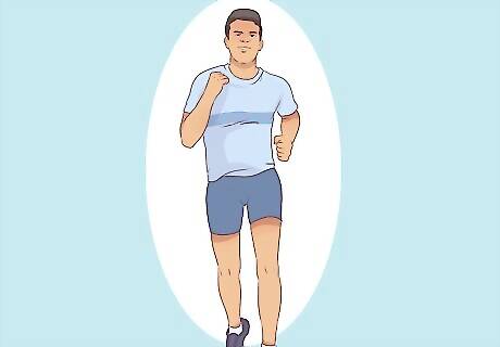 Run with a mid-foot strike. If you hit the ground mid-foot, you can power through your run more efficiently and won't over-extend your legs. A broader stride may cause you to hit the ground with your heels, which will burn precious energy. Your arms should swing forward and back naturally. Avoid clenching your fists or swinging your arms side-to-side, which wastes energy. Keep your stride light. Use your momentum and force of motion to propel your body forward, rather than pounding the ground. Your shoulders should be back, your head straight. Look 20 to 30 feet in front of you so you can anticipate and adjust for other competitors in your way who might cause you to break your stride.