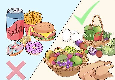 Clean up your diet. Even if you already have a relatively healthy and well-balanced diet, eliminate all junk food and soda in the months before your sprint triathlon. The fuel you put into your body is just as important as any other part of your training regimen. Your meals should consist of lots of fruits and vegetables, as well as plentiful lean protein. Bananas have the starch you need as well as potassium, so they are good pre- or post-workout snacks. Eggs are a good source of protein, as are meats such as chicken and turkey. Keep in mind that you'll want to eat breakfast at least two hours before the race. Three or four scrambled or hard-boiled eggs and a banana will give your body the fuel it needs for the big day.