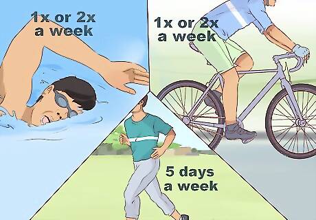 Spend more time on your weaker elements. Generally, you should try to swim once or twice a week, bike once or twice a week, and run at least five days a week. However, if you are a weaker swimmer or biker, you may want to add another session. Many beginning triathletes are most nervous about the swimming portion of the race. Fortunately, it is the first part and will go by quickly. You don't need to be a competition-level swimmer. However, you should be comfortable in the water. If you aren't a strong swimmer, you may want to swim three or four days a week instead of just one or two. Focus on spending time in the water and being comfortable there. The same goes for biking as swimming. If you aren't a particularly strong biker or don't have experience with racing, you might want to spend a little more time each week on your bike. The most important thing about each part of the event is not to be the most technically proficient, but to be comfortable and efficient at each skill.