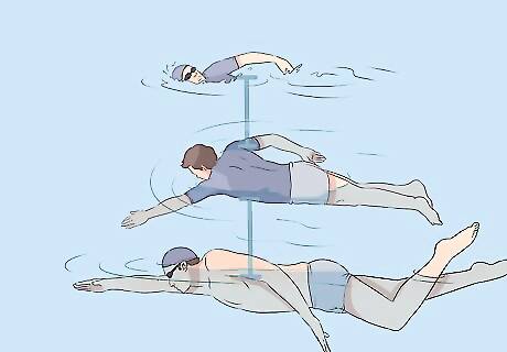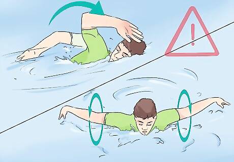 Stay on course. As part of your training, you should learn how to look ahead and keep swimming straight. During the race, only look down or forward. Glancing to the side or looking at other swimmers can get you off track. Every few strokes, try to pick your head up so you can look ahead to make sure you're not moving off course. This is particularly important if you're swimming in open water, because you won't have the benefit of lane markers to help guide you as you would in a pool. Make sure your kick is strong even as you're looking ahead to keep going straight to your goal. Find the easiest line to each buoy and follow it. Looking up frequently allows you to adjust course if another swimmer gets in your way or disturbs your line.