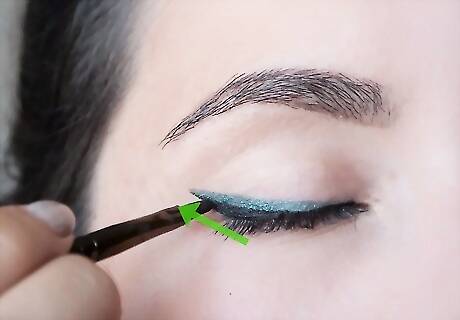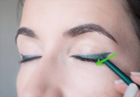 Line your top lash line. It's easiest to use the lighter color eyeliner out of the pair you've chosen. Saturated colors work beautifully for this step. You can create the line as thick as you desire, just remember that you'll be creating another line over it. Begin applying your eyeliner in the center of your lash line. Bring it out towards the outer corner of your lid. Let the line become thicker as you move it outwards. Then go the opposite way, bringing your liner into your inner corner. As you get closer to the corner, thin out your line. Create an eyeliner wing or cat eyes from the outer corner. This is optional, but creates a really cool effect when done with stacked eyeliner.