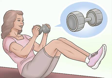Add a dumbbell. When you are ready to add another challenge, use a dumbbell. Choose something light to start off with, for example, 5 to 8 pounds (2 - 4 kg). Instead of clasping your hands in front of you, hold the dumbbell straight out in front of you. Then resume the exercise as usual and don’t forget to lift your feet. Make this step even more challenging by using a medicine ball, or by increasing the weight of your dumbbell.