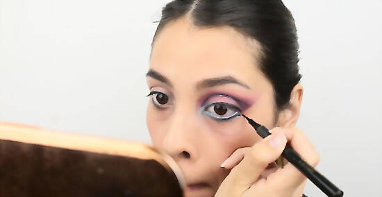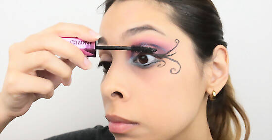 Create a few swirls with eyeliner. Use either a liquid or pencil eyeliner in black or dark brown. Trace a thin line across your upper lid, as close to the lash line as possible. When you get to the outer corner of your eye, extend the eyeliner at a slight upward angle toward your temple. Once you’ve extended the eyeliner by one-half to one inch (1.25 to 2.5 cm) beyond your eye, you can experiment with different curls and swirls. Swirl the end of the eyeliner line into an upward swirl toward your eyebrow. You can simply curl the end to give it an elegant curve, or continue swirling to make the eyeliner into a spiral. You can also make another branch off the eyeliner to make another downward facing curve or spiral. Branch off either from the corner of your eye, or closer to the end of the original eyeliner extension.