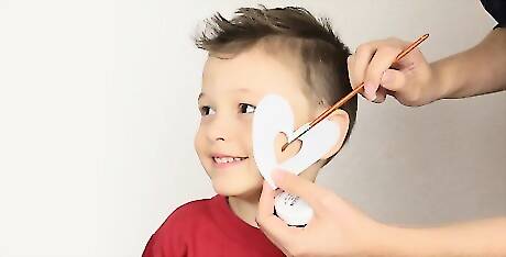 Pick a stencil or pattern. Many craft stores and costume shops sell face painting stencils that make it easy to create intricate designs with makeup. You can also create your own stencil by drawing a design on paper and cutting out the spaces you want colored in. To use a stencil, press the stencil against the face in the area you want to draw. Dampen a sponge with water and press it into your makeup palette color of choice. Blot the sponge over top of the stencil to fill in the open spaces with makeup. You can also do a base color underneath and put the stencil over top in a darker color.