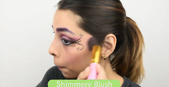 Put some shimmery blush on your cheeks. Use a light pink blush with lots of shimmer or glitter. Use an angled blush brush and apply the blush along your cheekbones. Blow off the excess and blend the brush into your skin.