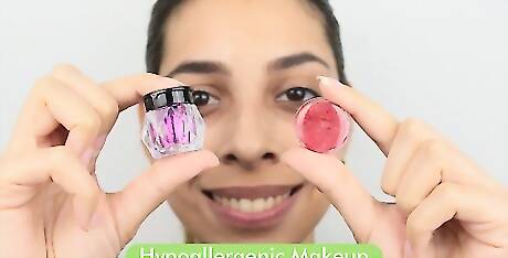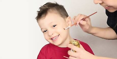 Choose a makeup type. There are actually a number of cosmetics and makeups that can be used for kids as well as adults. Depending on the effect you want to achieve, you can simply use adult makeup palettes, or you can go with a makeup designed for face painting. For face painting, you can either use makeup sticks that are like large crayons designed for skin, or you can buy face and body painting palettes that are applied with a brush. Kids usually have more sensitive skin than adults, so look for a hypoallergenic product or something designed for sensitive skin. Try to choose makeup colors that complement the color of the costume. For instance, if the costume is pink, blue, or purple, any of those colors in makeup will look great with the outfit. If the costume is green or yellow, opt for one of those two in makeup shades.