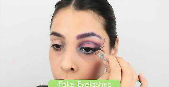 Add accessories. There are a number of accessories you can use to enhance fairy makeup and add more glitter, shine, and definition to the look. These include rhinestones on your skin and false eyelashes, both of which can be applied with eyelash glue. To apply jewels and rhinestones to your face, dip a cotton swab or small brush into the eyelash glue and dab a small amount onto the flat back of the rhinestone. Then, press the rhinestone against your skin for a few seconds, until the glue holds. Apply rhinestones around or under your eye, above your eyebrows, or on your cheeks. To apply false eyelashes, apply a small amount of glue to the inner rim of the eyelashes. Then use your finger or tweezers to apply the eyelashes to your upper eyelid, as close to the lash line as possible. You can also body stickers to enhance the look. For fairy-like stickers, look for swirls and designs that match the color scheme you’ve chosen.