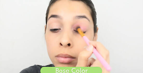 Apply a base color to your lids. No matter what color scheme you're working with, apply a medium-shade eyeshadow to your eyelid below the crease. Use an eyeshadow brush to apply a thin layer. For instance, if you're working with purples, apply a medium-purple. If you're working with green and yellow, apply a medium green shade. If you're working with blue, pink, and purple, apply a medium pink.