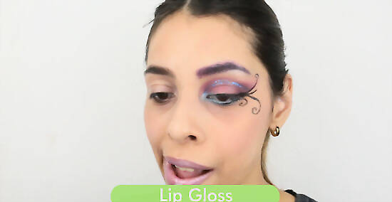 Add some gloss to your lips. To finish off the glittery and sparkling makeup, apply a coat of light pink lip gloss. You can also use your favorite lipstick, and then add a thin dusting of glitter on top. To make your lips match your eyes perfectly, put a small amount of lip gloss on your lips, then use a brush to apply one of the eyeshadow colors on top of the gloss. Use your finger to blend the eyeshadow into the lip gloss.