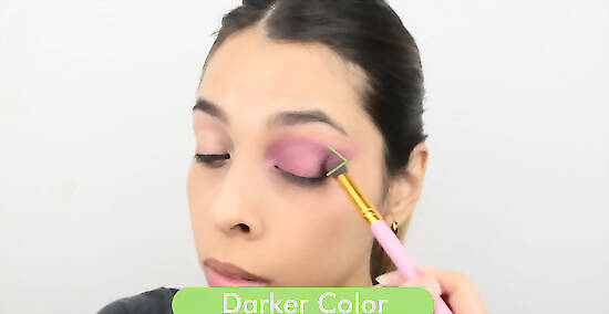 Add a darker color to the crease. With an angled brush, apply a darker shade to the crease of the eye, which is the semicircular area just above where your eyeball ends. At the outer corner, use this same darker color to make a V-shape in the corner of your eye. Swirl your brush around in the eyeshadow and tap the brush to remove excess. You can always add more later if necessary. Use a dark purple if you're working with purples. Use a dark green if you're working with green and yellow. Use a dark blue or purple if you're working with blue, pink, and purple.