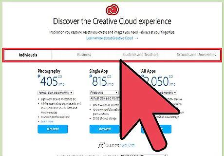 Click on the tab that best represents who you are. Photoshop can be purchased for individual use, business use, students and teachers, or for schools and universities.