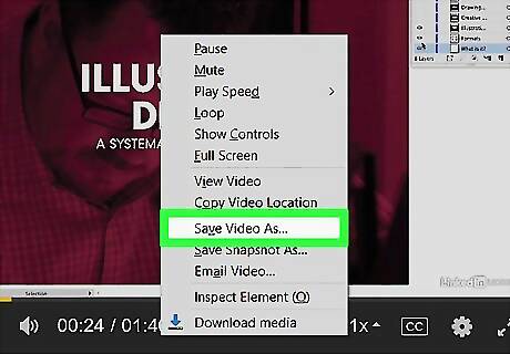 Click Save video as. It's in the right-click popup menu. This will display open a "Save As" pop-up window that will allow you to change the video name and select a location to save the video. Optionally you can: Change the video name: Click the bar next to "File name:" and change the video name. It's a good idea to change the name of the video to something you will recognize, like "Intro to Programming with C", or "Adobe Photoshop Fundamentals Pt 1". Select a Save location: Your 'Quick Access' folders are in the sidebar to the left of the file browser. You can even right-click and select "New" and then select "New Folder" to create a new folder for your Lynda videos.
