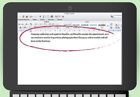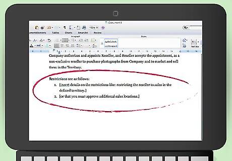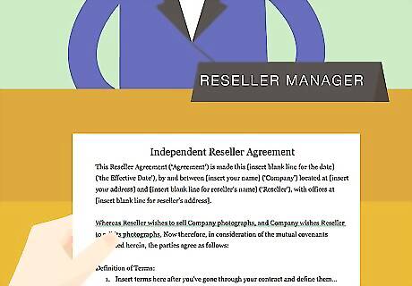 Appoint the reseller. You need to include a provision where you appoint the reseller and identify what the reseller will do. For example, your reseller might market and sell your photographs. You should also state whether the appointment is exclusive or non-exclusive. A sample appointment provision might read: “Company authorizes and appoints Reseller, and Reseller accepts the appointment, as a non-exclusive reseller to purchase photographs from Company and to market and sell them in the Territory.”