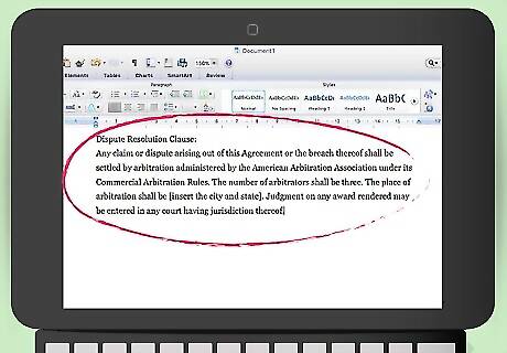 Add a dispute resolution clause. If a dispute arises, you will probably want to try and settle the dispute outside of court. You could include a provision where each side agrees to arbitrate the dispute. Arbitration is like a trial; however, you present your case to a panel of arbitrators instead of a judge. Arbitration is typically faster and cheaper than lawsuits. It is also private. You can include an arbitration provision like the following: “Any claim or dispute arising out of this Agreement or the breach thereof shall be settled by arbitration administered by the American Arbitration Association under its Commercial Arbitration Rules. The number of arbitrators shall be three. The place of arbitration shall be [insert the city and state]. Judgment on any award rendered may be entered in any court having jurisdiction thereof.”