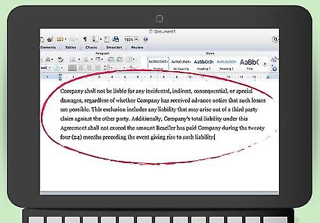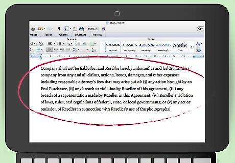 Include an indemnification clause. This is an important clause to have. With it, the reseller agrees to compensate you for any harm arising out of the contract. When the reseller looks over your agreement, he or she might push back on this clause, but you should include it in your draft. An indemnity clause could read: “Company shall not be liable for, and Reseller hereby indemnifies and holds harmless company from any and all claims, actions, losses, damages, and other expenses including reasonable attorney’s fees that may arise out of: (i) any action brought by an End Purchaser, (ii) any breach or violation by Reseller of this agreement, (iii) any breach of a representation made by Reseller in this Agreement, (iv) Reseller’s violation of laws, rules, and regulations of federal, state, or local governments; or (v) any act or omission of Reseller in connection with Reseller’s use of the photographs.”