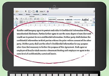 Include a confidentiality clause. You also want to protect any confidential information that you share with the reseller. For example, you might share a tentative list of photographs you intend to take in the future, or you could share a customer list. You should include a provision where you and the reseller agree to protect each other’s confidential information. In your definition section, you should define “confidential information.” A sample provision could read: “Reseller and Company agree to protect each other’s Confidential Information from unauthorized disclosure. Parties further agree to use the same degree of care that each would use to protect its own confidential information. Neither party shall disclose the confidential information to third parties without the prior written consent of the other party. Neither party shall use the other’s Confidential Information for any purpose other than that necessary to further the purpose of this Agreement. Each agent or employer of Reseller shall execute a document binding said employee or agent to the same level of confidentiality contained herein.”