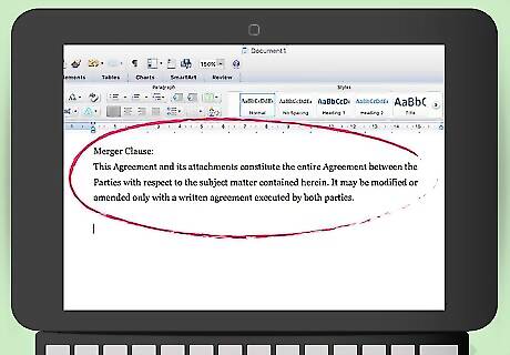 Include a merger clause. This clause states that the contract contains the entire agreement between you and the reseller. You should also state that any changes to the contract must be made in a writing signed by both parties. A sample merger clause would read: “This Agreement and its attachments constitute the entire Agreement between the Parties with respect to the subject matter contained herein. It may be modified or amended only with a written agreement executed by both parties.”