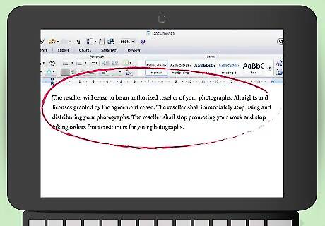 Explain the effects of termination. Once the agreement ends, you want to make sure that the reseller stops selling your photographs and stops claiming any relationship with you. You should include a provision that explains that the parties will make a clean break after a termination. You should specifically identify the following effects: The reseller will cease to be an authorized reseller of your photographs. All rights and licenses granted by the agreement cease. The reseller shall immediately stop using and distributing your photographs. The reseller shall stop promoting your work and stop taking orders from customers for your photographs.