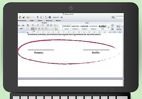 Insert a signature block. You should insert lines for both your signature and the reseller’s signature. Also include a line for the date. Just above the signature lines, include this language: “In witness whereof, the Parties have signed this Agreement on the date above.”