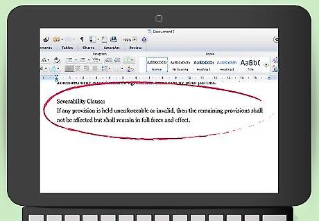 Add a severability clause. If you go to court in a breach of contract lawsuit, then the judge might find that one provision of the contract is invalid. You will want to explain that the rest of the contract should still be enforced. You can clarify this by including a severability clause. A sample severability clause could read: “If any provision is held unenforceable or invalid, then the remaining provisions shall not be affected but shall remain in full force and effect.”