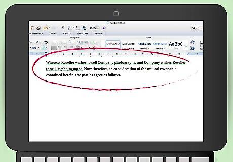 Include your recitals. Recitals are the “whereas” clauses that appear in standard contracts. Your recitals summarize why you and the reseller are entering into the agreement. These recitals can be fragment sentences. Sample recitals could read: “Whereas Reseller wishes to sell Company photographs, and Company wishes Reseller to sell its photographs. Now therefore, in consideration of the mutual covenants contained herein, the parties agree as follows.”