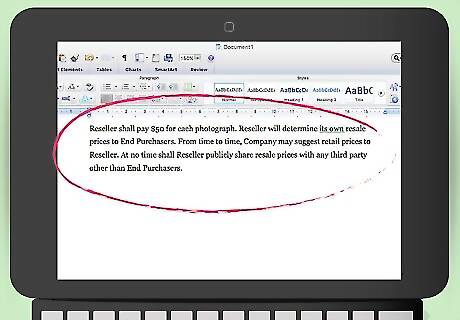 Set the price for your photographs. The reseller buys your photographs and then sells them. Accordingly, you should identify the price that the reseller must pay you for the photographs. You might also want to explain who sets the reseller’s price. Typically, the reseller sets the prices he or she asks consumers to pay. However you can still offer suggested prices. A sample provision might read: “Reseller shall pay $50 for each photograph. Reseller will determine its own resale prices to End Purchasers. From time to time, Company may suggest retail prices to Reseller. At no time shall Reseller publicly share resale prices with any third party other than End Purchasers.”