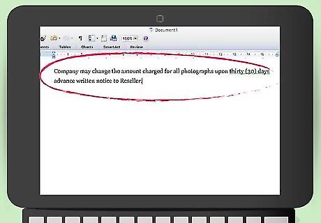 Reserve the right to change your prices. You might want to raise or lower the prices your reseller pays you for each photograph in the future. For this reason, insert a provision granting you the right to revise the prices. You could write, “Company may change the amount charged for all photographs upon thirty (30) days advance written notice to Reseller.”