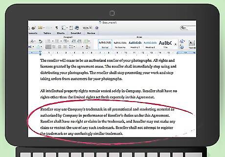 Limit the use of your trademarks. You might have a trademark, such as your company name. You can grant the reseller the right to use your trademark in its marketing materials. However, you should clarify that the reseller does not gain any rights in your trademark by using it in this manner. For example, you could write: “Reseller may use Company’s trademark in all promotional and marketing material as authorized by Company in performance of Reseller’s duties under this Agreement. Reseller shall have no right or claim in the trademark, and Reseller may not make any claim or contest the use of any such trademark. Reseller shall not attempt to register the trademark or any confusingly similar trademark.”
