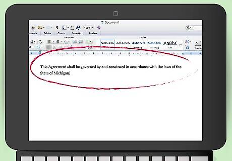 Add a choice of law provision. You can decide which state’s law to use to interpret the contract. Typically, you should choose the state where you do business. Your choice of law provision could read: “This Agreement shall be governed by and construed in accordance with the laws of the State of Michigan.”